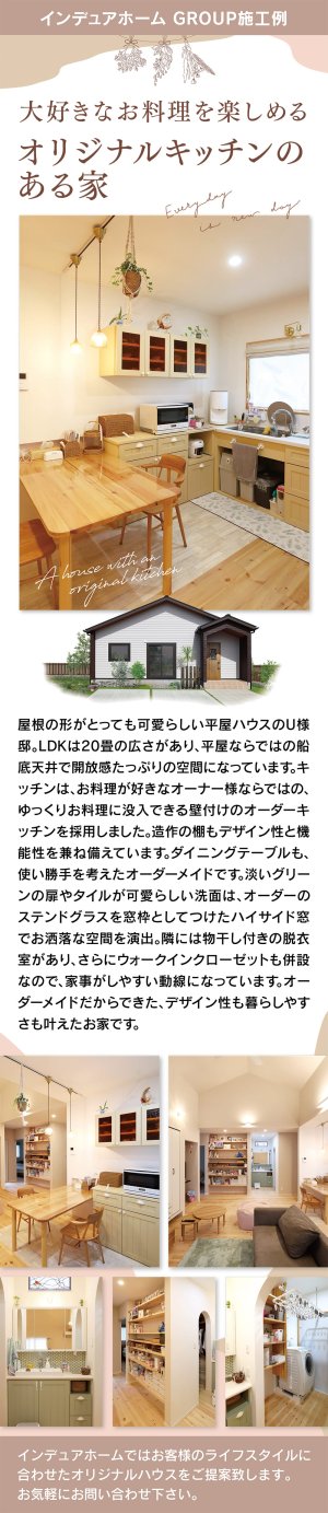 屋根の形が可愛らしい平屋のU様邸。20畳のLDKと船底天井で開放感あふれる空間に。オーダーキッチンや造作棚、ステンドグラス窓などこだわりのデザインと家事動線を両立した住まいです。
